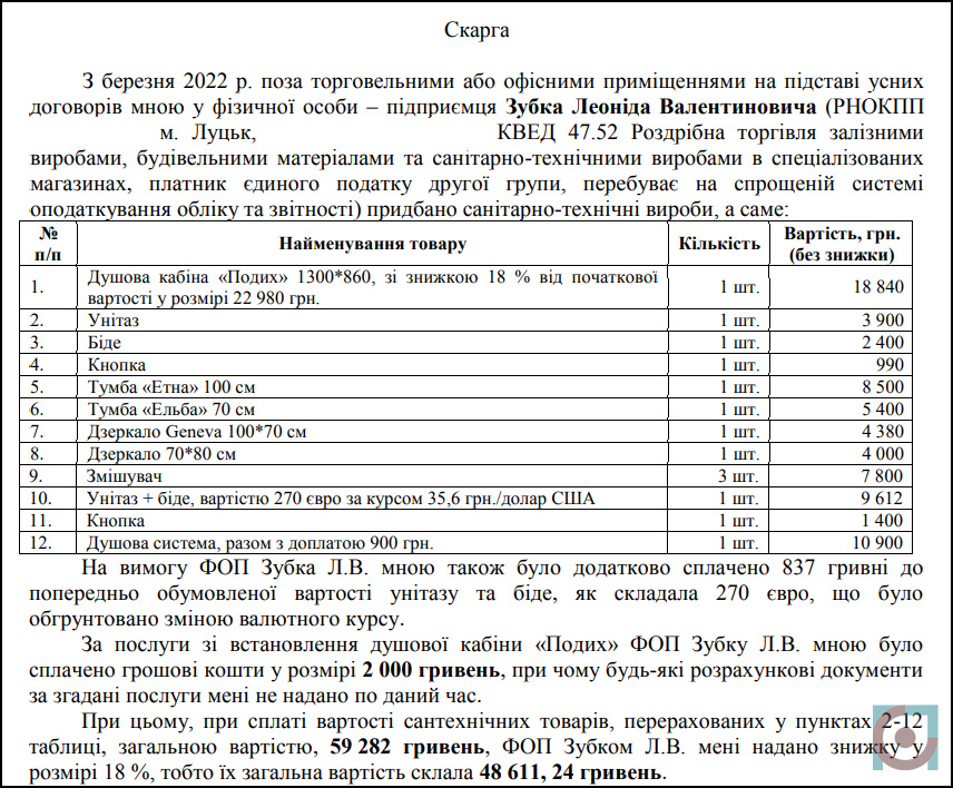 У березні 2022-го лучанка Наталія Чернящук вирішила зробити ремонт у своєму приватному будинку, аби можна було переїхати з квартири. Для цього вона придбала у місцевого підприємця Леоніда Зубка сантехніку на понад 70 тисяч гривень.