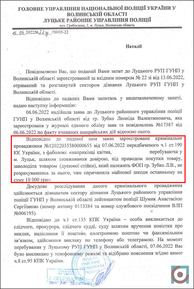 – 1 червня на мій особистий номер зателефонував невідомий номер і представився працівником міськвідділу, що він є слідчим. Що, нібито, звернулися зі скаргою і відкрили кримінальне провадження у зв’язку з тим, що не було розрахунку за товар. Коли я перевірила даний номер телефону у програмі Getcontact, мені вибило – Олег Зубко. Коли ввела в Google Олег Зубко, то мені вибило, що він є заступником начальника управління боротьби з наркозлочинністю у Волинській області і ніякого відношення до Луцького РУП, немає абсолютно, – розповідає Наталія.