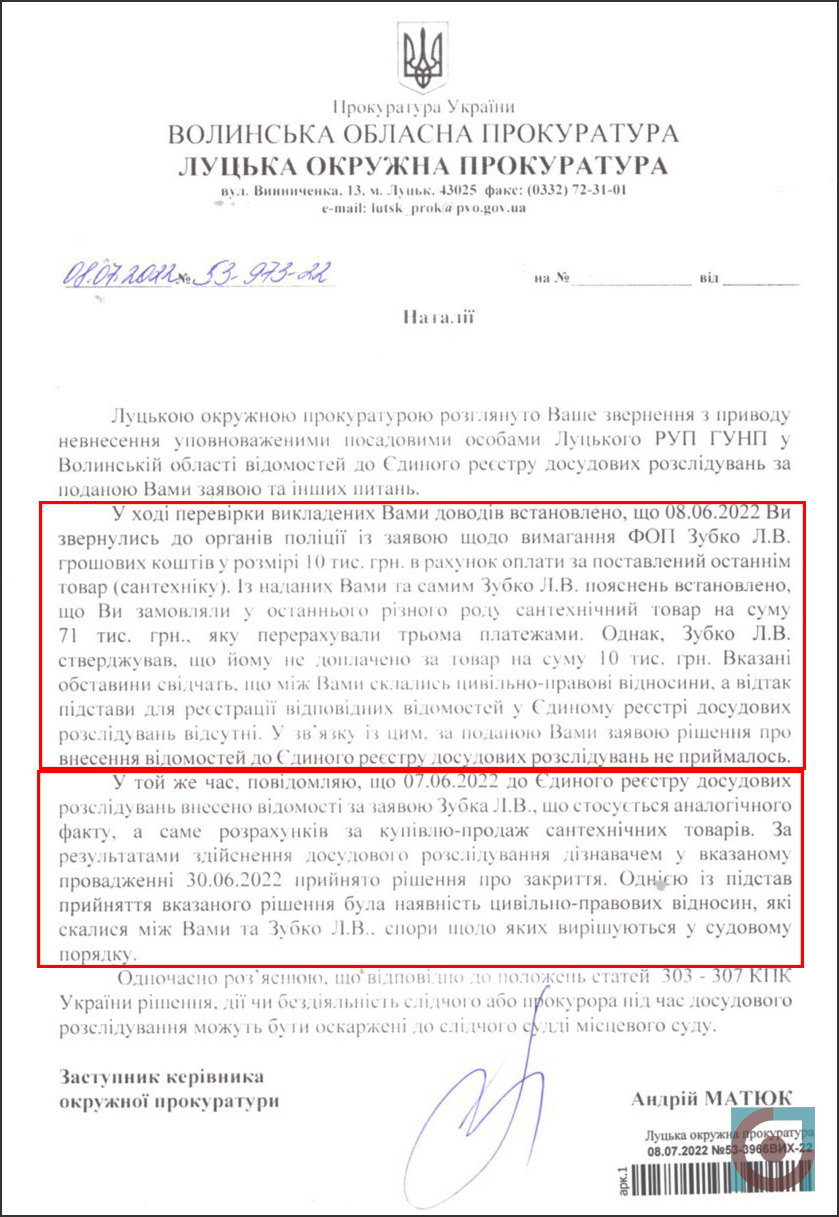 Поки «Сила правди» готувала цей матеріал, Луцька окружна прокуратура надала відповідь, що 30 червня кримінальне провадження щодо Наталії Чернящук закрите, бо в справі наявні цивільно-правові відносини, а відтак суперечку треба вирішувати лише в суді. Тобто таку ж, яку поліція надала на заяву Наталії Чернящук за місяць до цього, але яку НЕ надала у відповідь на заяву Леоніда Зубка.