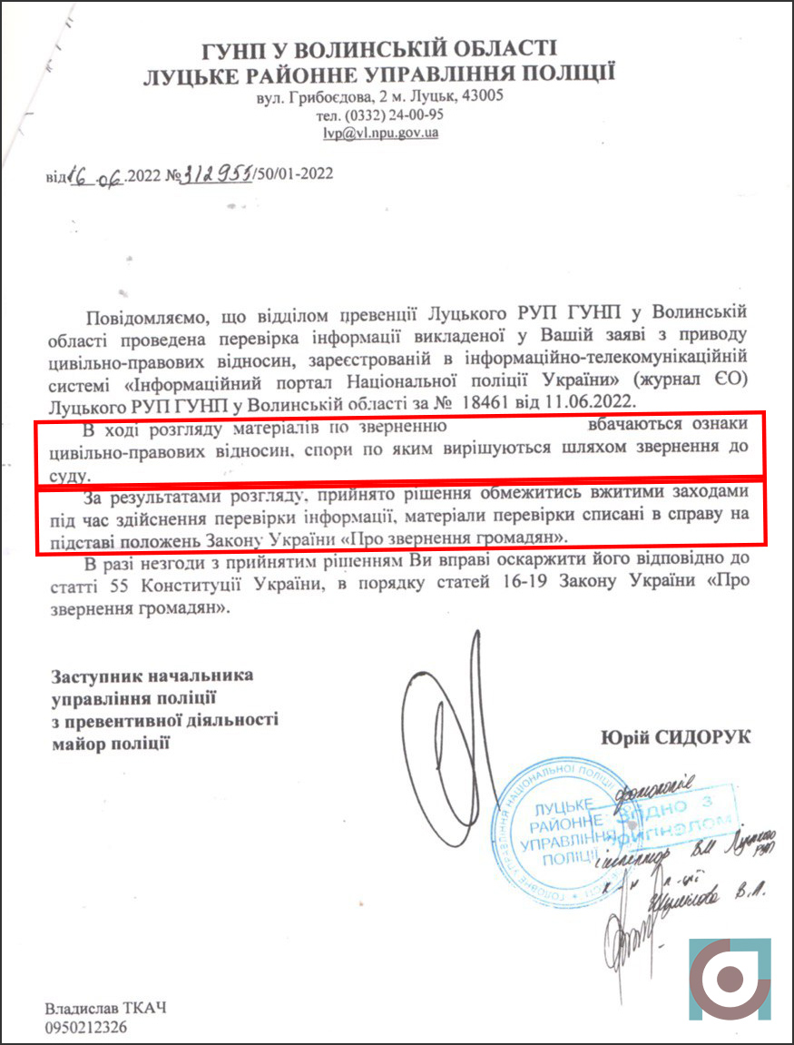 Пані Наталія відмовилася доплачувати гроші, навіть після розмови з Олегом Зубком. Тож невдовзі її викликали у Луцьке районне управління поліції.