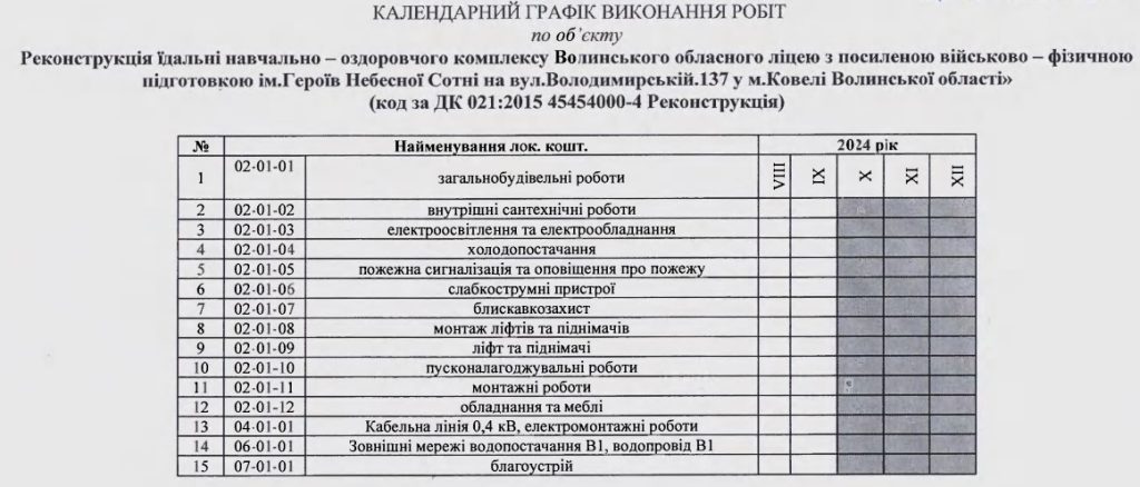 Волинський обласний ліцей з посиленою військово-фізичною підготовкою імені Героїв Небесної Сотні докинув близько 7 мільйонів гривень на реконструкцію їдальні свого навчально-оздоровчого комплексу в Ковелі. Торік у вересні навчальний заклад замовив ремонт єдиному учаснику тендеру за понад 70 мільйонів гривень. Таким чином підрядник – компанія «Волиньекобуд» – отримає і ту суму, на яку знизила очікувану ціну закупівлі на торгах.