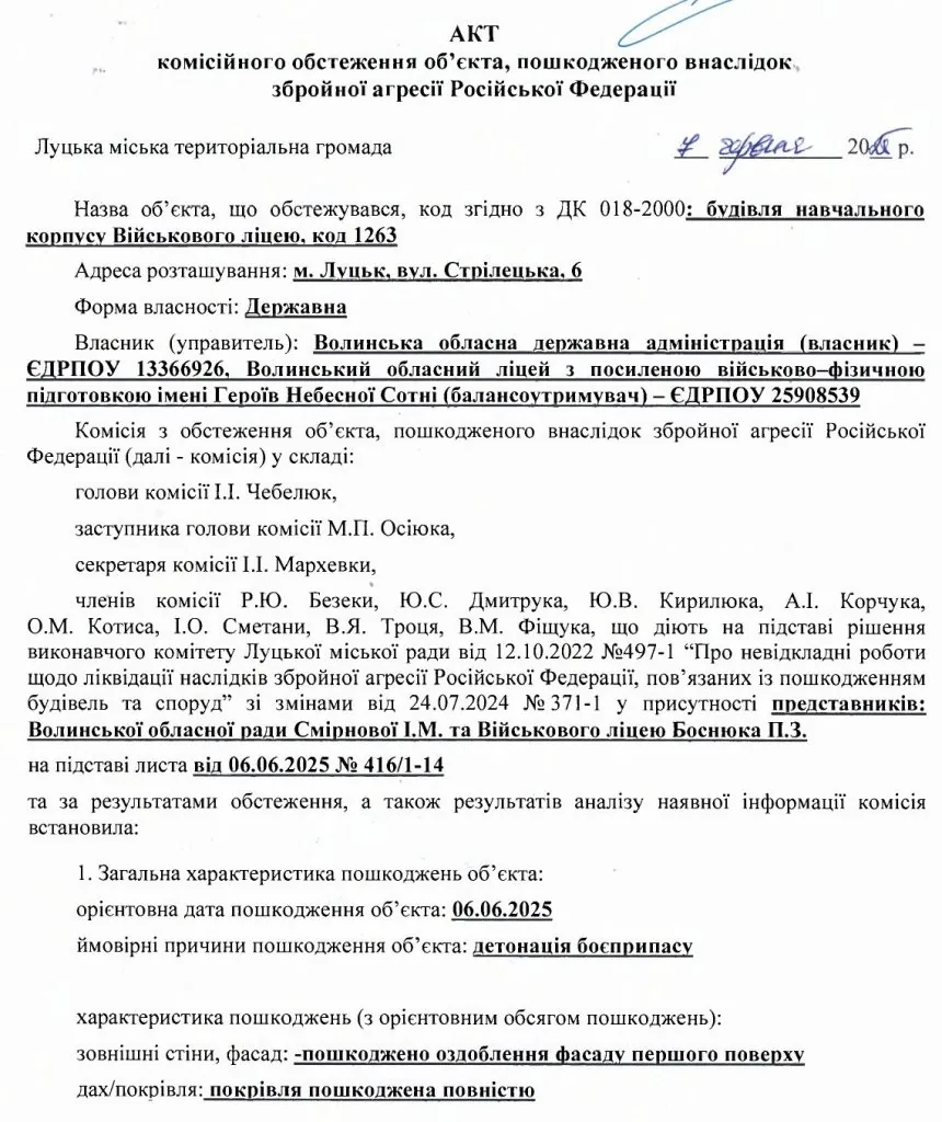 6 червня Луцьк зазнав обстрілів унаслідок повітряної атаки російських безпілотників та ракет. Зокрема, постраждали і будівлі обласного ліцею: приміщення навчального корпусу, спорткомплекс та укриття. До прикладу, в акті обстеження споруди, де навчаються ліцеїсти, сказано, що приміщення понищене унаслідок детонації боєприпаса, зокрема повністю зруйнована покрівля, потребують ремонту перші чотири поверхи.