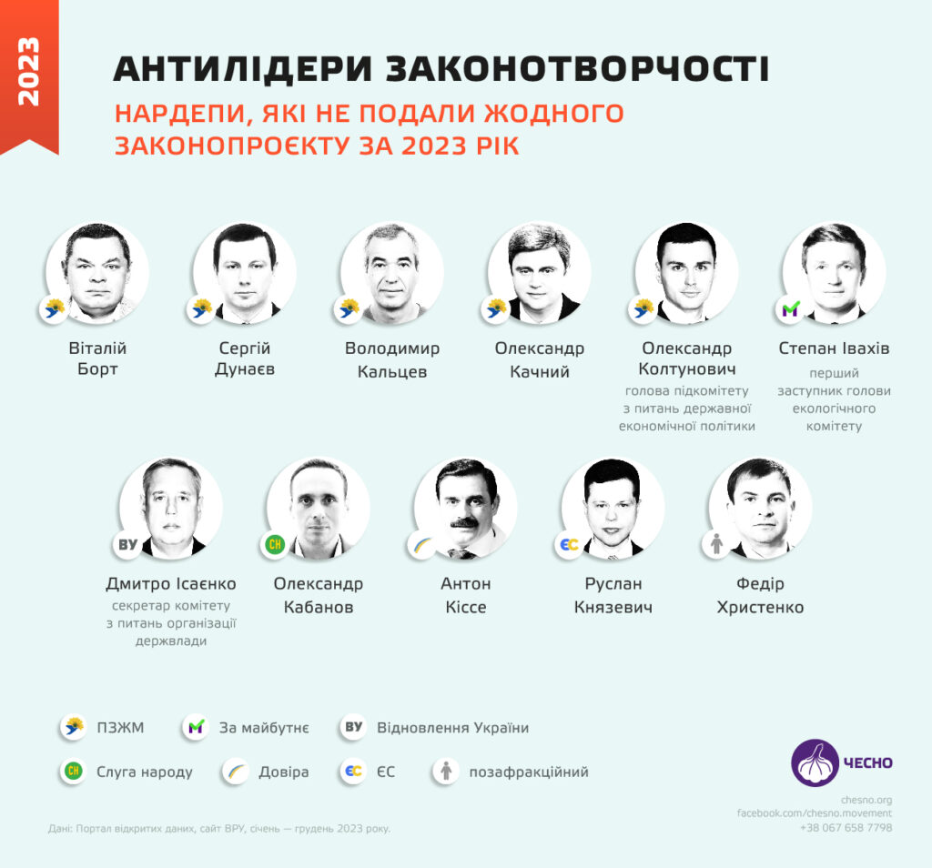 Водночас одинадцятеро нардепів Верховної Ради не подали або ж не поставили підпис під авторством жодного законопроєкту чи постанови протягом 2023 року, більшість із них — депутати від забороненої партії ОПЗЖ. У цьому переліку є й один обранець з Волині — представник одномандатного виборчого округу №21 на Ковельщині Степан Івахів.