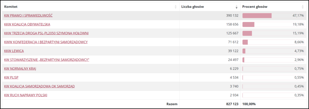 Політична сила «Право і справедливість» отримала 47,17% голосів, друге місце посіла «Громадянська коаліція» (19,18%), третє – «Третій шлях» (15,19%). Решта політичних сил отримали менше 10% голосів.