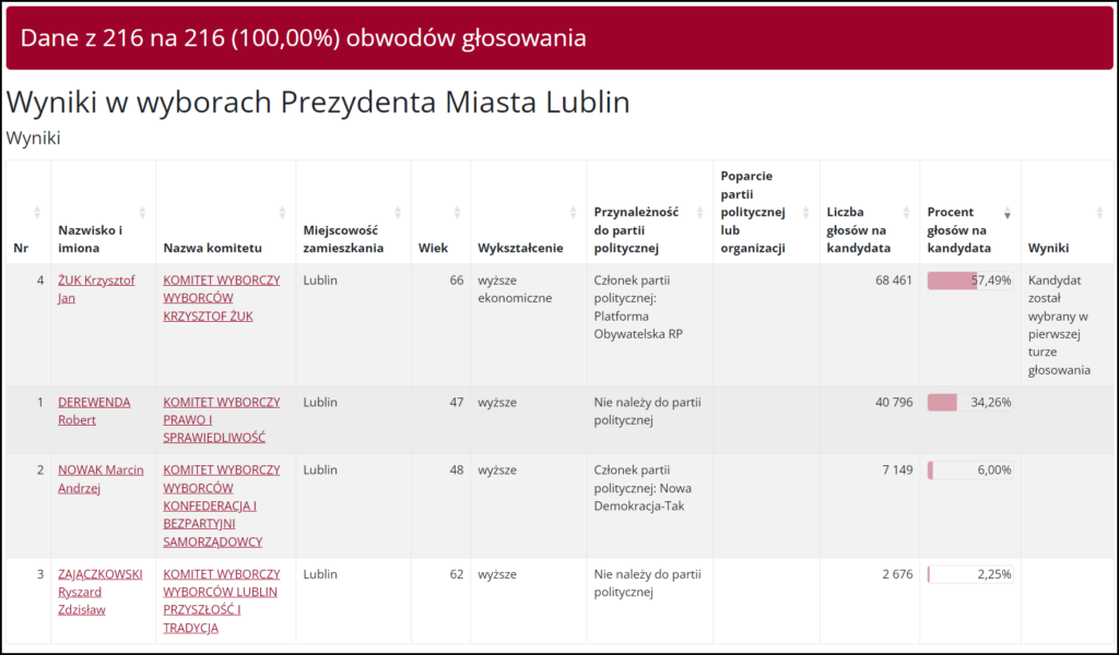 На посаду президента Любліна (так у Польщі називається посада міського голови) балотувалося чотири кандидати: позапартійні 47-річний Роберт Деревенда та 62-річний Ришард Заячковський, 48-річний Марчін Новак із партії «Нова демократія – Так» та 66-річний чинний президент із партії «Громадянська платформа Польщі» Кшиштоф Жук.