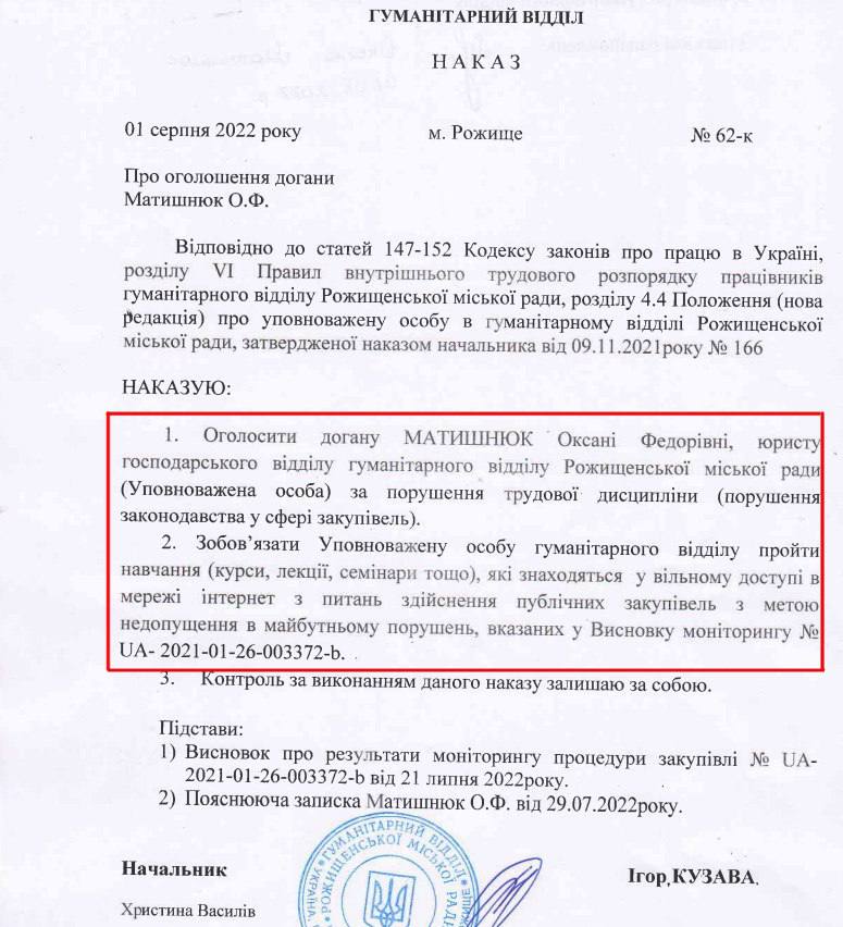 Більше ніж за рік закупівлю вирішили перевірити аудитори і виявили три порушення: тендерна документація не відповідає вимогам, оприлюднення інформації про закупівлю відбулося пізніше, ніж цього вимагає законодавство та у договір було внесено зміни, що не передбачені законом. Аудитори зобов’язали установу усунути порушення, притягнувши уповноважену за закупівлю особу до дисциплінарної відповідальності.