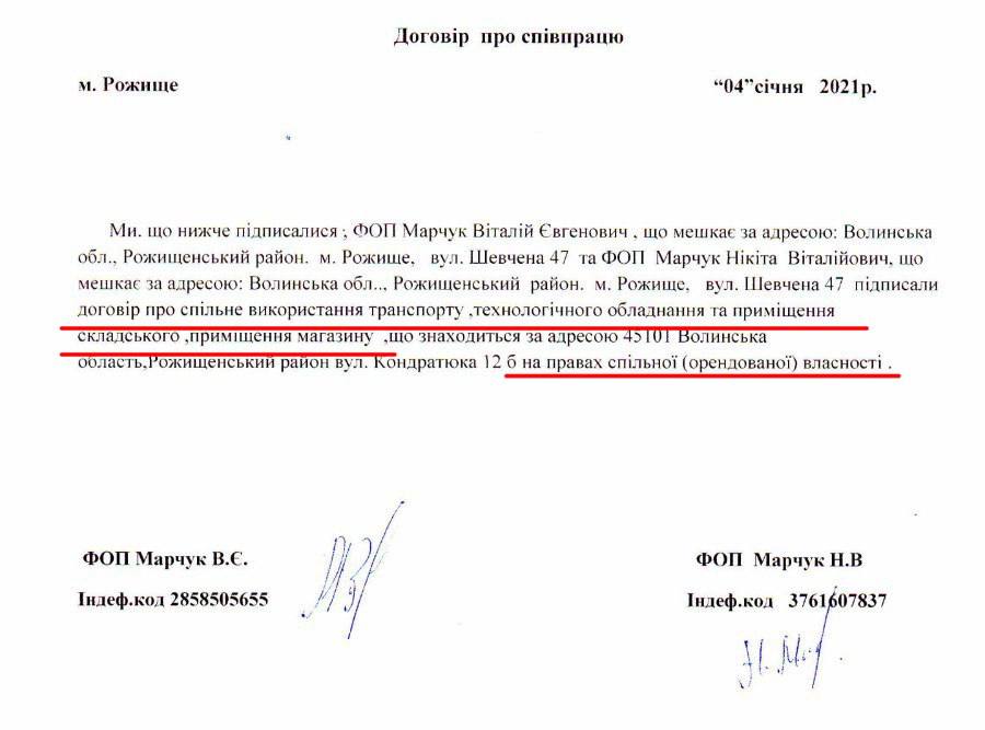 Аналіз постачальницької діяльності Нікіти показав, що він не єдиний підприємець Марчук у Рожищі. Часто контракти на постачання продуктів харчування у ті ж комунальні установи укладає його тато Віталій Марчук. Документація за 2021 рік, подана Нікітою на тендери, показує, що вони не просто спільно ведуть підприємницьку діяльність, а й використовують один і той же транспорт, технологічне обладнання, склади та приміщення магазину.