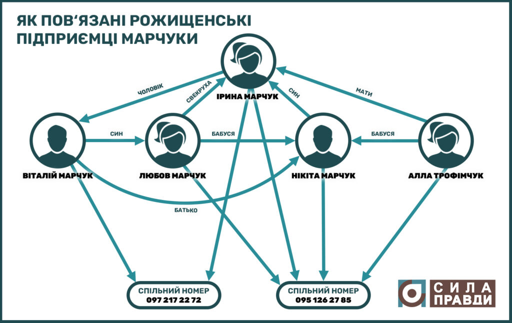 Проте, поєднує ФОПів-Марчуків із бюджетними структурами Рожища не тільки підприємницька діяльність, а й родинні зв’язки з працівницею фінансового відділу міської ради. Річ у тім, що дружина Віталія і мама Нікіти Ірина Марчук працює бухгалтером у Рожищенській міськраді, якій підпорядковуються кілька структур, з якими й укладали контракти її син та чоловік.