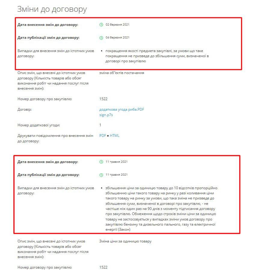 За місяць після підписання договору гуманітарний відділ Рожищенської міськради та підприємець Нікіта Марчук внесли зміни, які стосувалися покращення якості товару без збільшення суми закупівлі. Ще через два місяці у договір внесли чергові зміни, які суперечили попереднім, адже за ними ціна на товар збільшилася, нібито через коливання вартості риби на ринку.