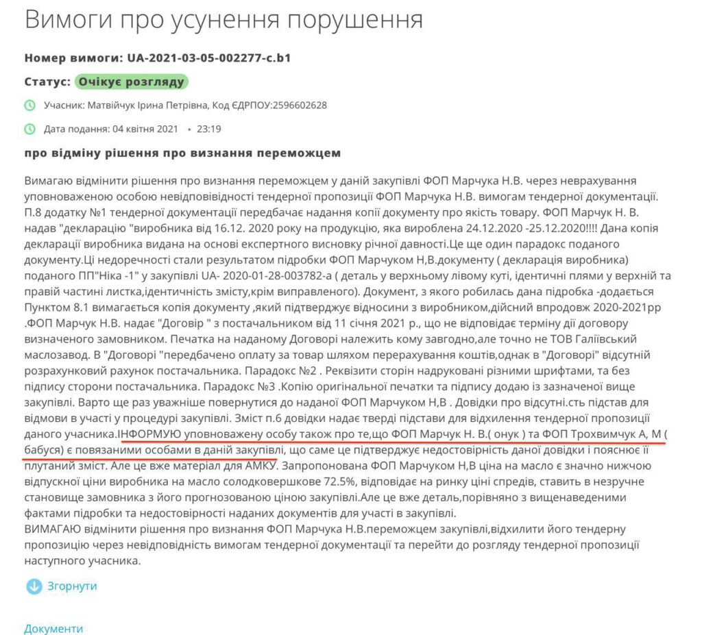 У закупівлі на 2500 кілограмів вершкового масла за понад 400 тисяч гривень на тендер подалося троє учасників: Нікіта Марчук, Алла Трофімчук та Ірина Матвійчук. Саме вона згодом висунула вимогу скасувати рішення про визначення переможця. Підприємиця вказала замовнику на невідповідність поданої документації і родинні зв’язки між Нікітою Марчуком та Аллою Трофімчук.