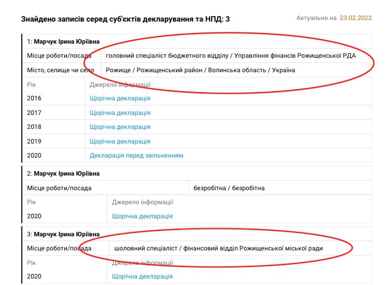 Угоди Ірина Марчук укладала і з відділом освіти та молоді Рожищенської районної державної адміністрації, у якій до цього працювала, та гуманітарним відділом Рожищенської міської ради, вже будучи бухгалтеркою міськради.