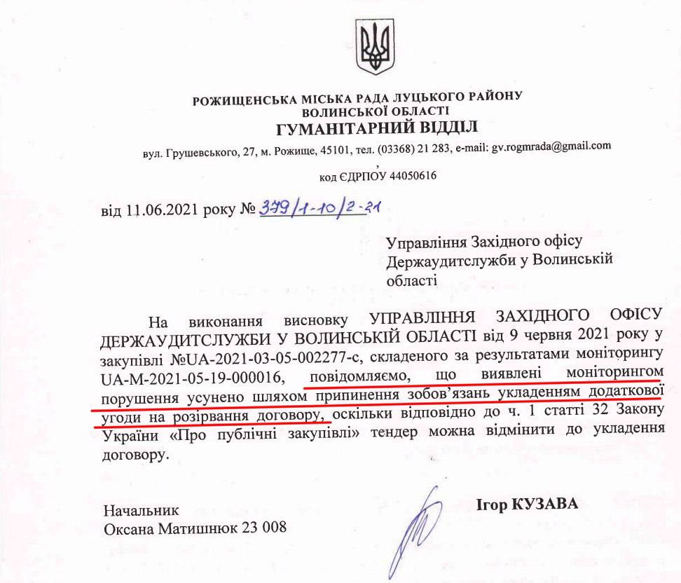Державна аудиторська служба України промоніторила закупівлю і також виявила порушення. Як наслідок, з підприємцем Нікітою Марчуком, який переміг у тендері, розірвали договір.