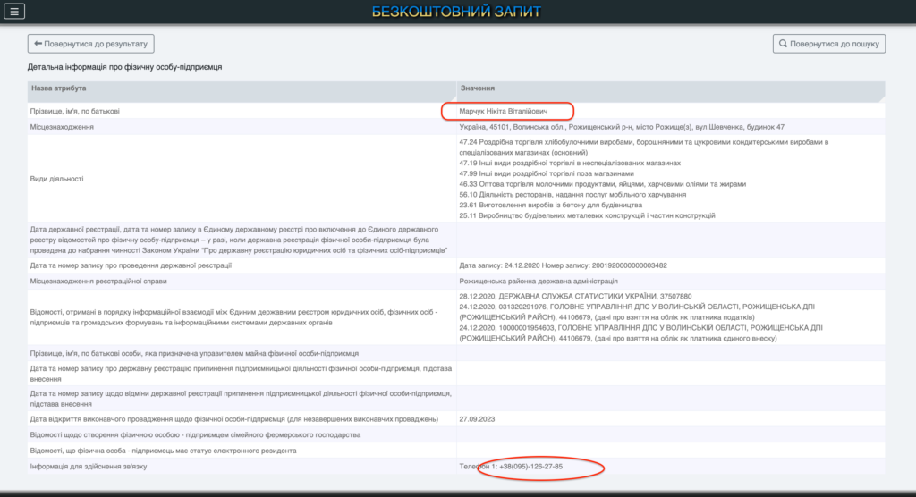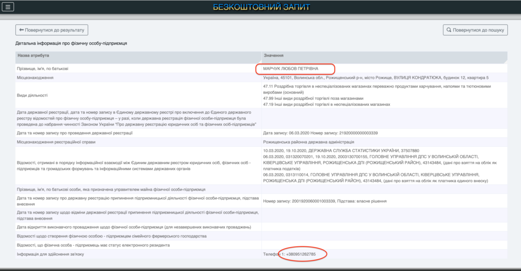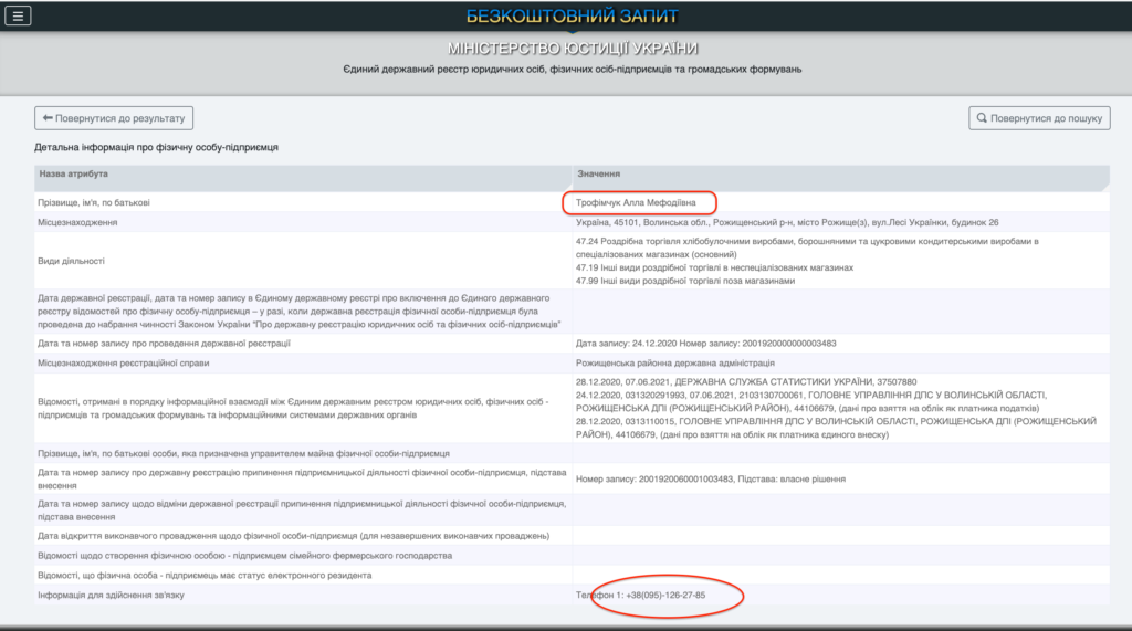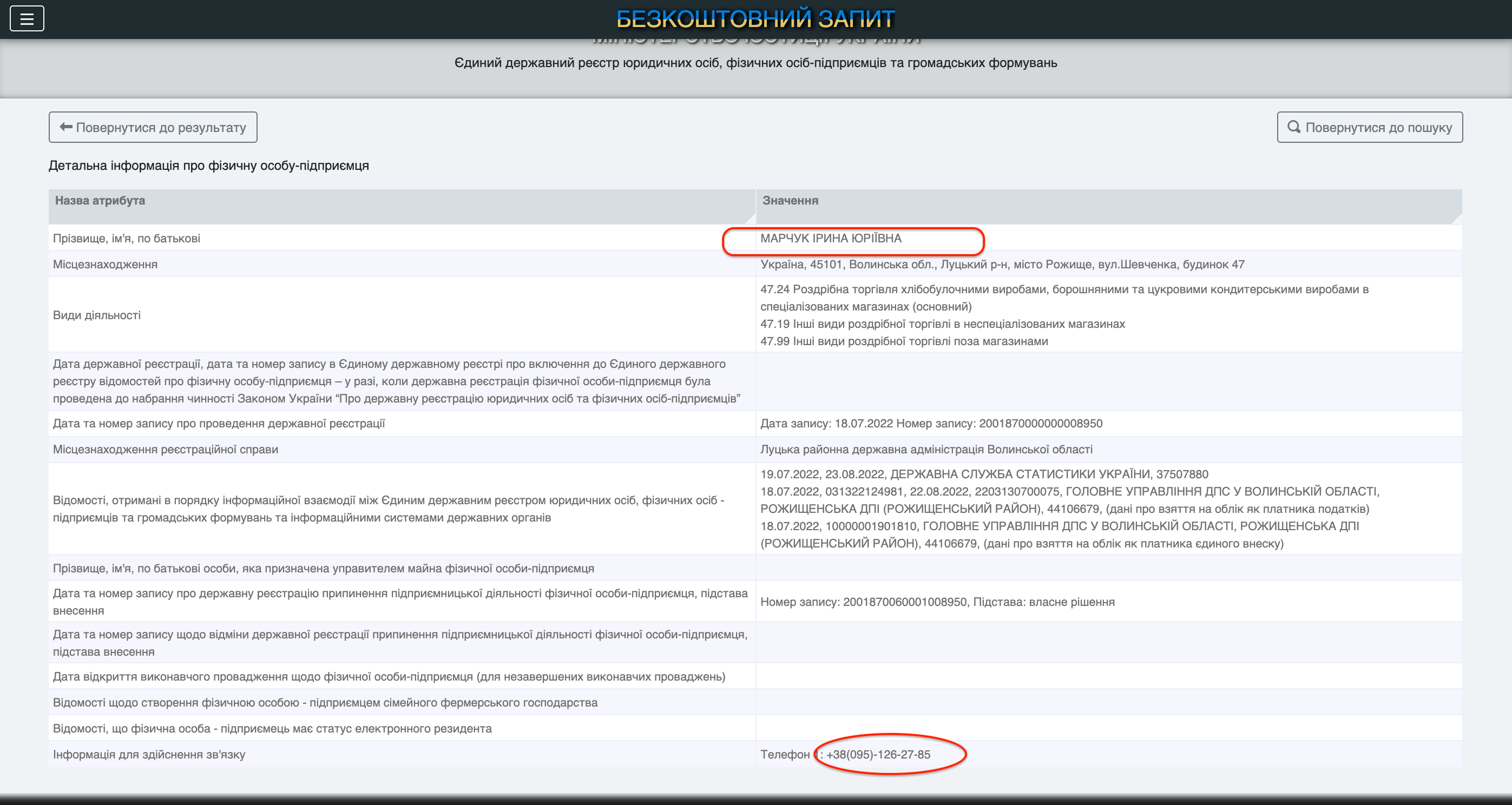 Кажуть, диявол криється в деталях. Так сталося і у випадку з сімейним підрядом Марчуків. Виявилося, що номер телефону, який Ірина Марчук вказала під час реєстрації підприємцем, водночас належить ще трьом ФОПам: синові Нікіті Марчуку, мамі Аллі Трофімчук та свекрусі Любові Марчук.