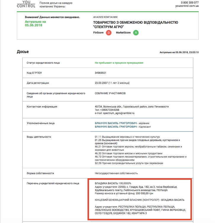 Окрім того, згідно даних аналітичної системи YouControl, кінцевим бенефіціаром діяльності підприємства «Спектрум Агро» є мешканець сусідньої Республіки Польща Василь Владика.