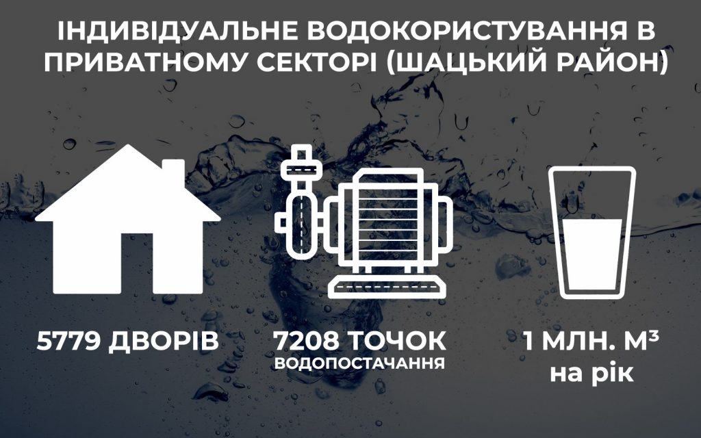 Окремий розділ відведено у звіті науковців НААН водокористуванню у Шацькому районі. Експерти підрахували приблизні обсяги води, що витрачається в індивідуальних садибах, туристичному і аграрному секторах.