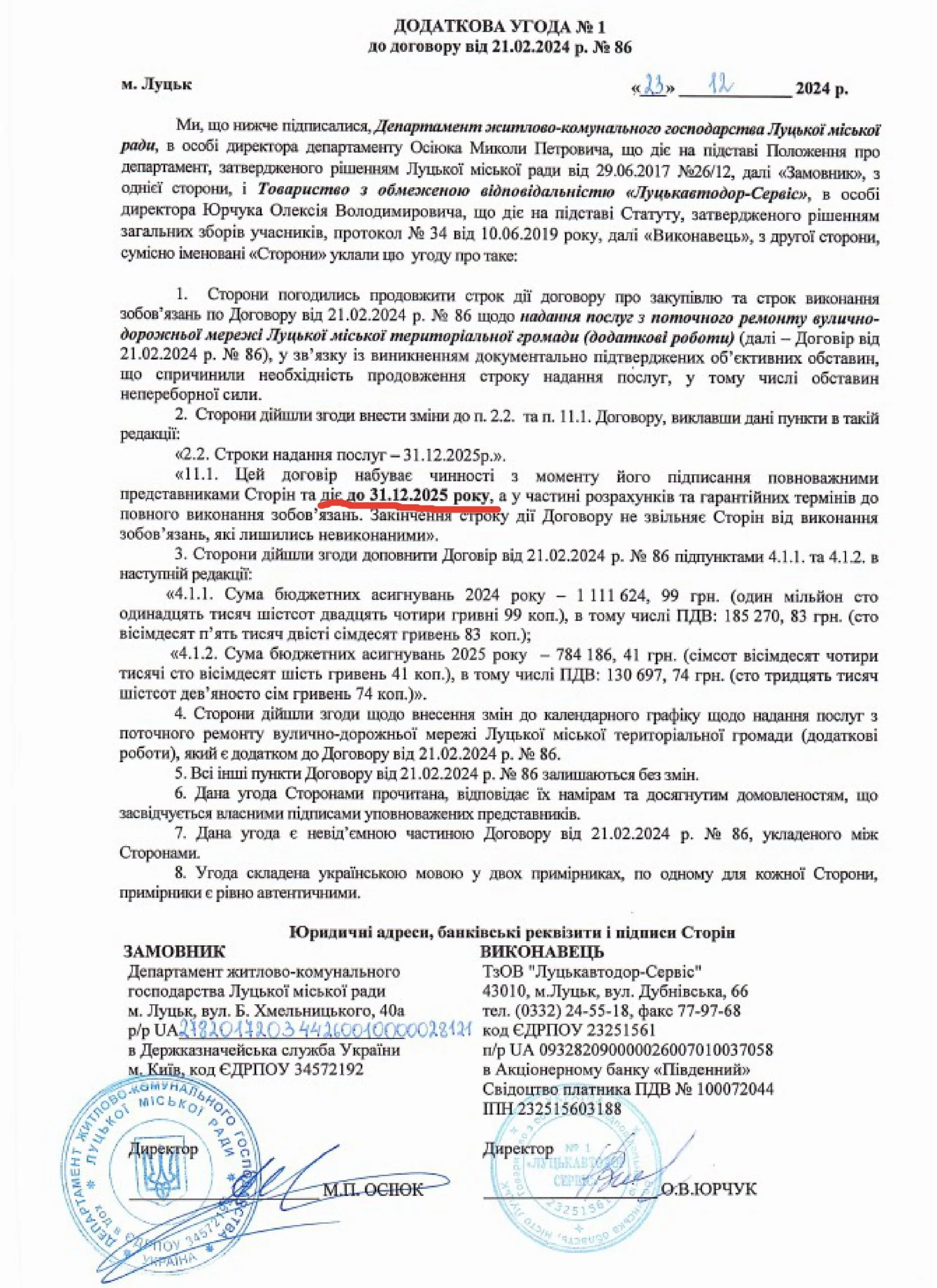У підсумку моніторингу Держаудитслужба порушень у діях чиновників не виявила, адже Закон України «Про публічні закупівлі» передбачає, що закупівля додаткових послуг у того самого виконавця робіт може здійснюватися протягом трьох років після укладення договору про закупівлю й при цьому загальна вартість додаткових послуг не перевищує 50 відсотків ціни основного договору. Відтак, за додатковим договором «Луцькавтодор-сервіс» отримав майже 2 мільйони гривень, за які повинен був до 31 грудня 2024 року відремонтувати 80 вулиць.
