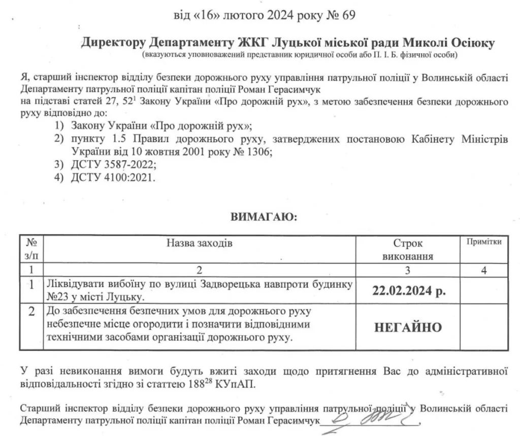 У відповідь департамент ЖКГ пояснив все листами від патрульних поліцейських, датованих лютим. З-поміж іншого, вони нібито вимагали негайно залатати вибоїни на вулиці Задворецькій.