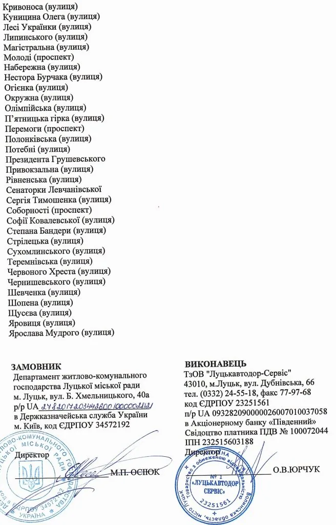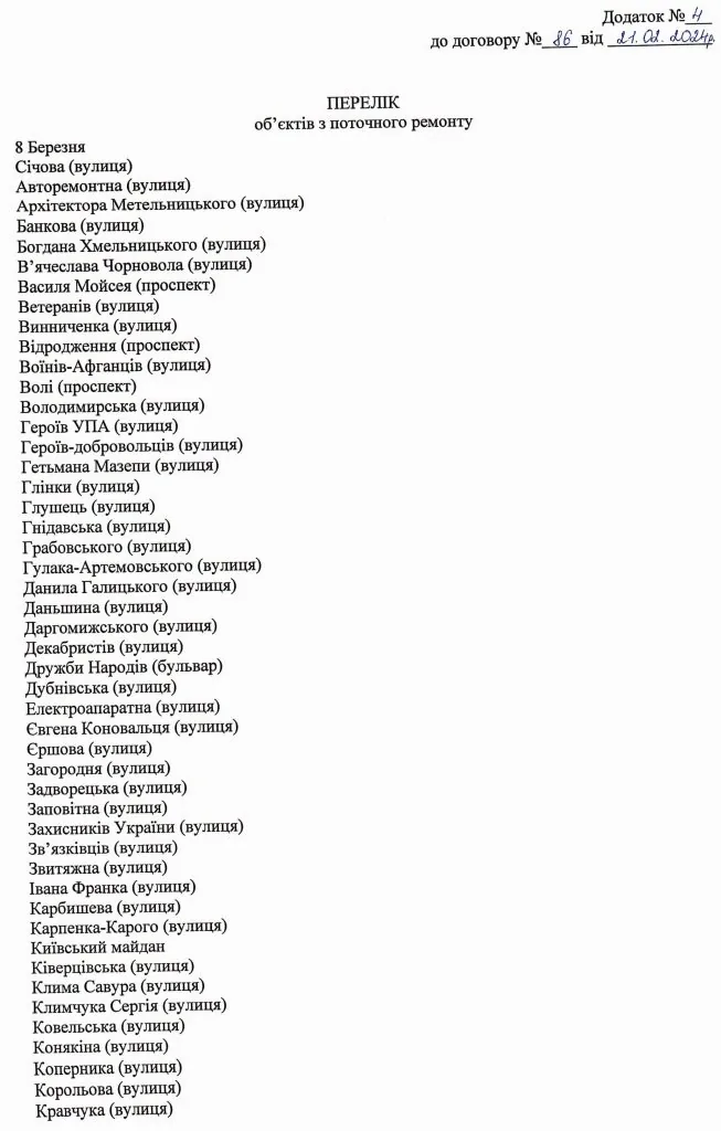 За договором від 10 січня ця фірма зобов’язалася до 31 грудня 2024-го засипати ями та вибоїни піщано-щебеневою сумішшю, зробити ямковий ремонт, провести холодне фрезерування асфальтобетонного покриття, влаштувати покриття з вирівнюючим шаром, повісити щити дорожніх знаків на опори та інше.