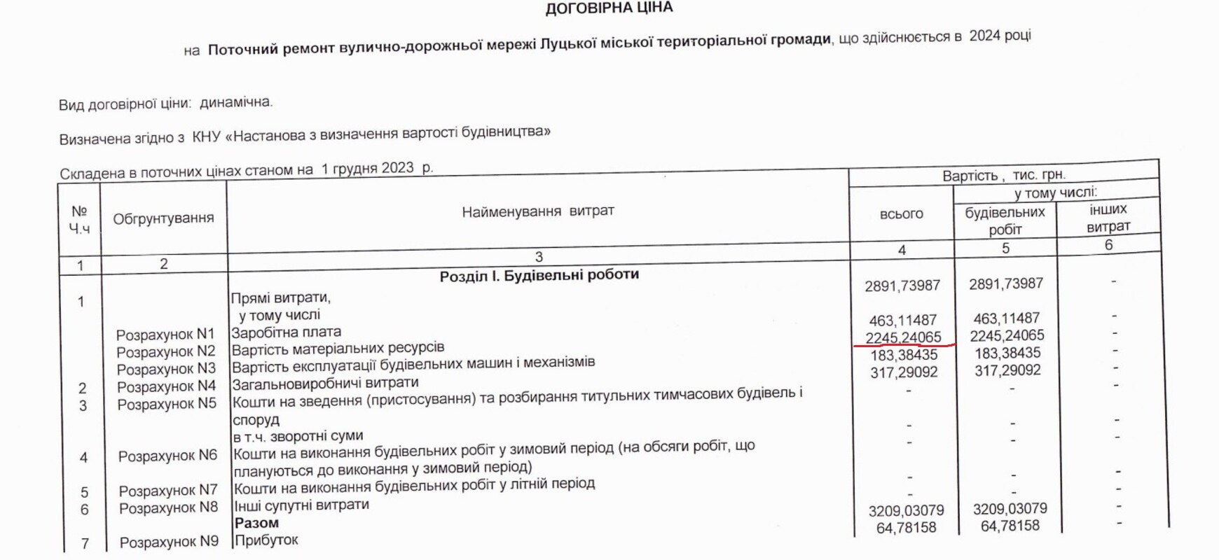 Списку вулиць у документах замовника в електронній системі немає. У кошторисі сказано, що левова частка суми 2,9 мільйона – це прямі витрати на будівельні роботи, зокрема вартість матеріальних ресурсів означена в договорі сумою в майже 2,3 мільйона гривень. Прибуток фірми за цим договором очікувався трохи менше 65 тисяч гривень.