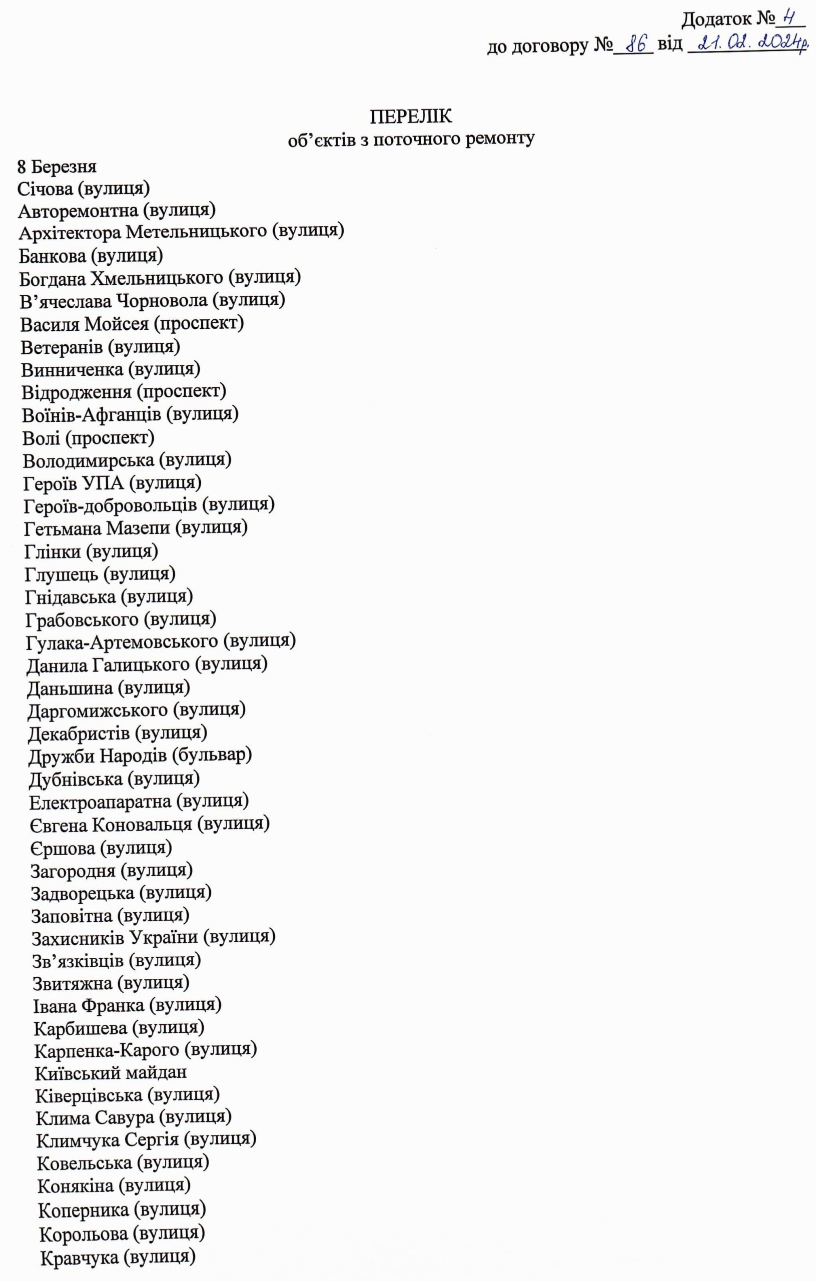 За договором від 10 січня ця фірма зобов’язалася до 31 грудня 2024-го засипати ями та вибоїни піщано-щебеневою сумішшю, зробити ямковий ремонт, провести холодне фрезерування асфальтобетонного покриття, влаштувати покриття з вирівнюючим шаром, повісити щити дорожніх знаків на опори та інше.