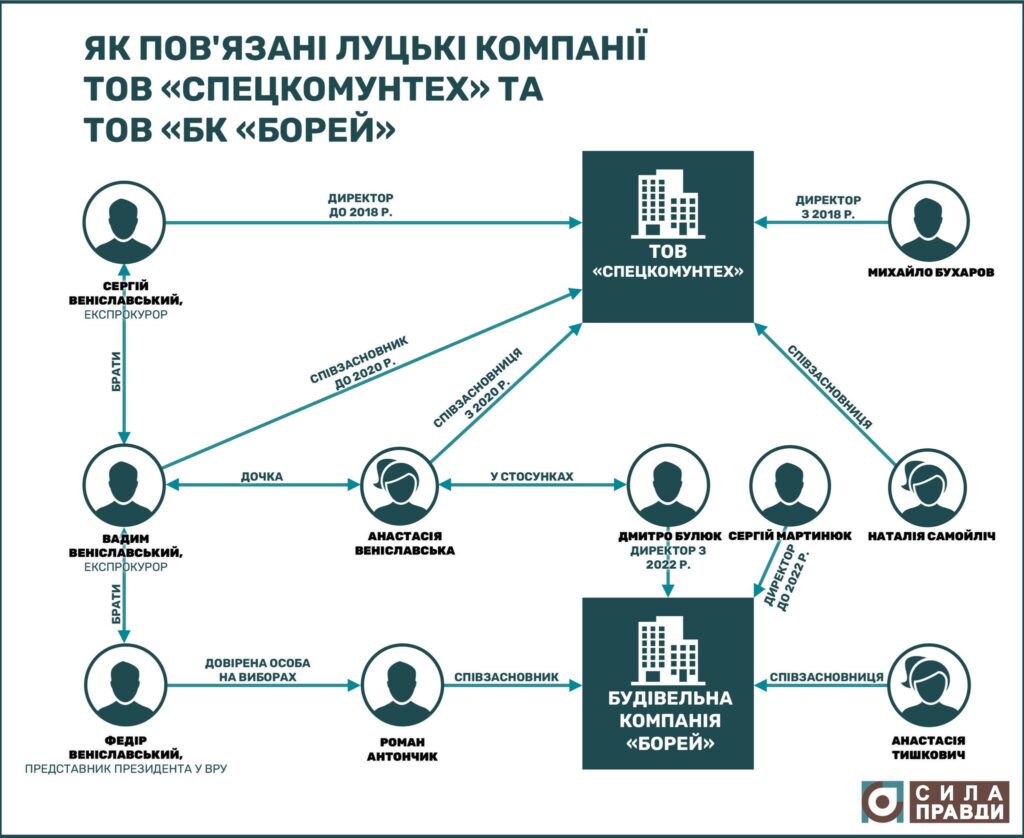 Через деякий час зв’язки «Борею» з родиною Веніславських поглибились ще більше – на місце Сергія Мартинюка прийшов лучанин Дмитро Булюк – бойфренд Анастасії Веніславської, яка є співвласницею фірми «Спецкомунтех».
