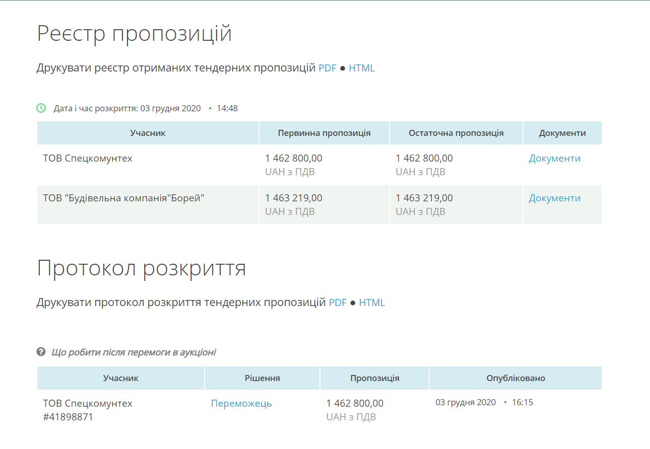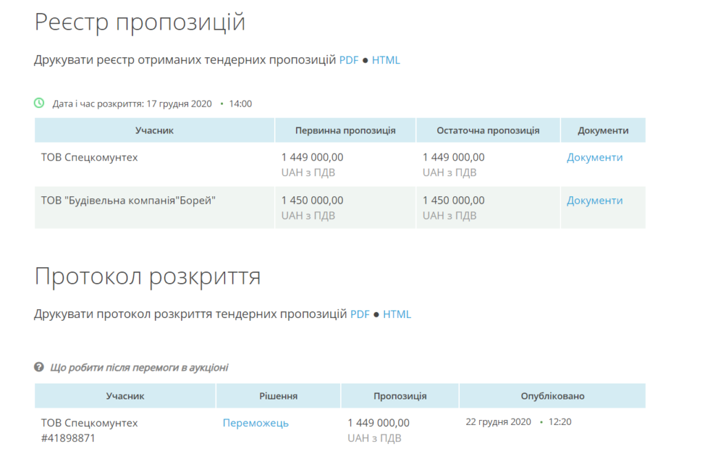 Ті ж конкуренти завантажили свою документацію в один день з різницею в кілька хвилин: «Спецкомунтех» – усю потрібну документацію, а «Борей» – знову ті ж дві архівні теки, що були пошкоджені і не відкривалися. Їхні ціни відрізнялися лише на тисячу гривень і вони, звісно, не торгувались на аукціоні.