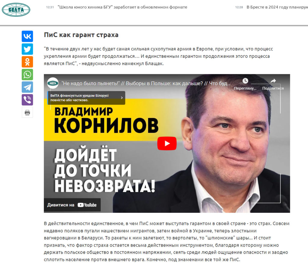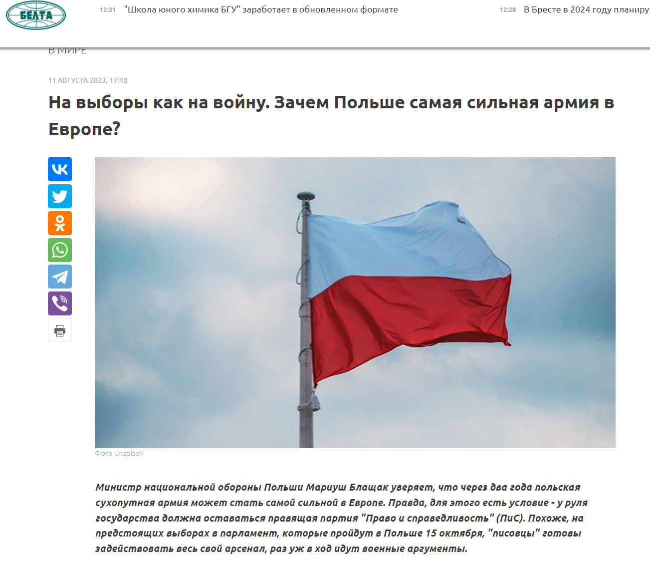 Наприклад, на сайті білоруського телеграфного агентства «БелТа» є стаття із назвою «Навіщо Польщі найсильніша армія в Європі?». У тексті навіть є посилання на Міністра національної оборони Польщі Маріуша Блащака, який розповів, що за два роки польська армія за два рок може стати найсильнішою в Європі. Слова польського посадовця є правдиві, адже його цитату можна знайти на сайті «Gazeta Prawna». Але далі на сайті «БелТа» написали повну маячню, що польська армія стає сильнішою, щоб тримати поляків у страху.