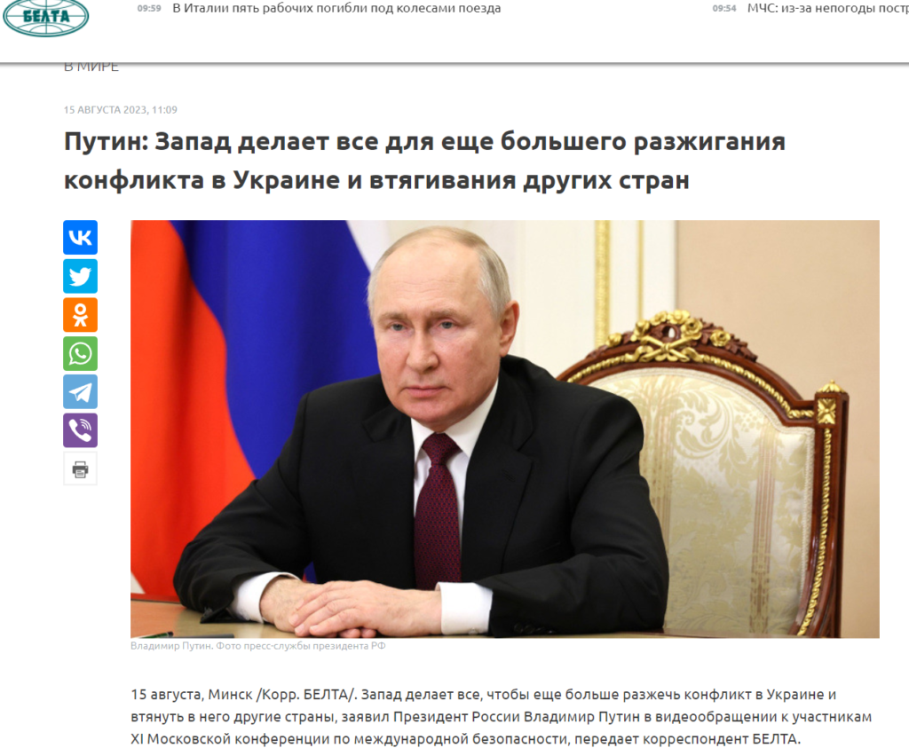 У білоруській пропаганді з посиланням на російські сайти намагаються виправдати дії країни-агресора Росії та перекласти відповідальність на інших. Наприклад, як у тексті з посиланням на російського президента «Путін: Захід робить все для ще більшого розпалювання конфлікту в Україні та втягування інших країн».