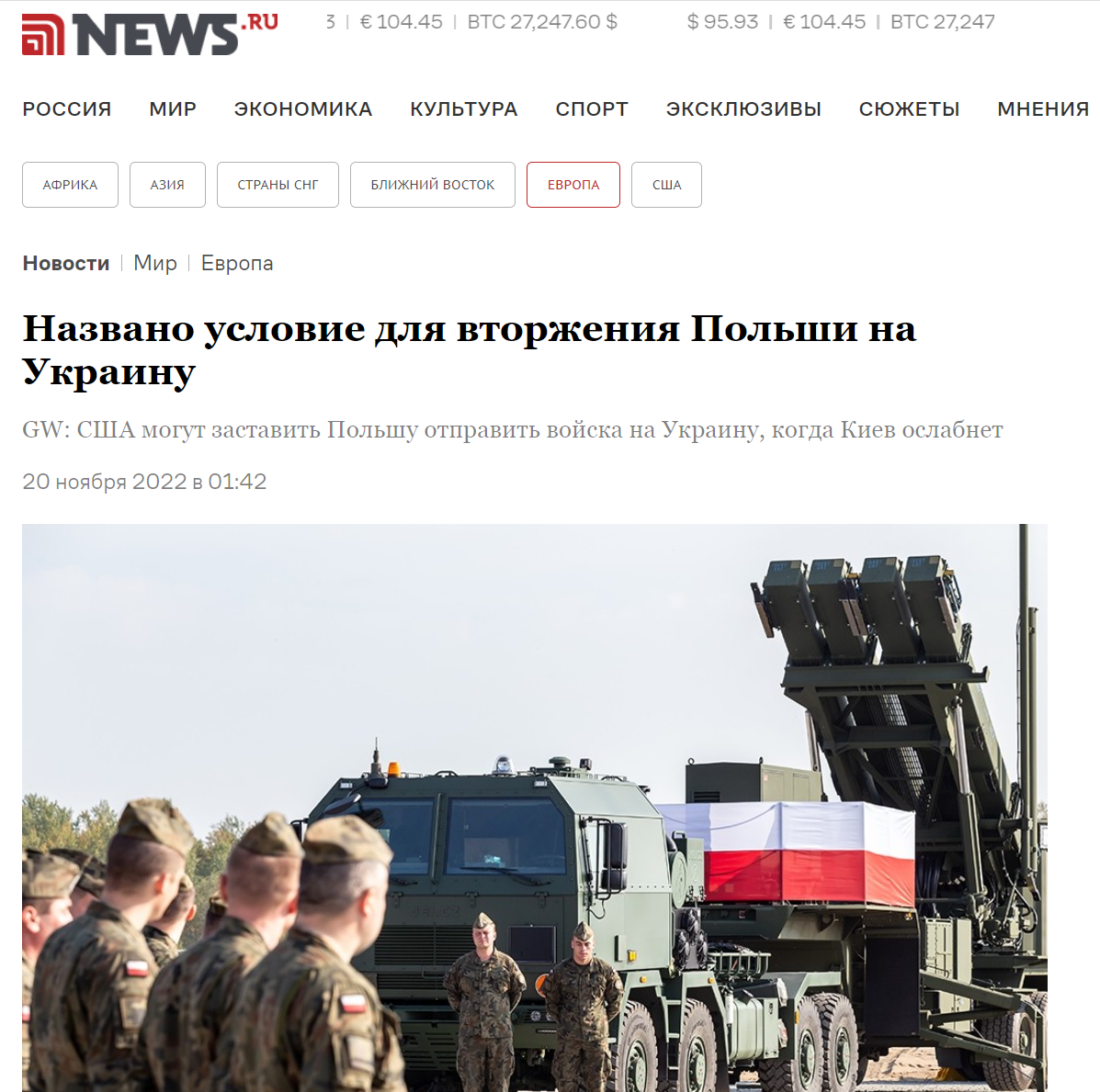 Крім України, зараз активно розганяються фейки та маніпуляції про Польщу, яка підтримала Україну після повномасштабного вторгнення Росії. Наприклад, на сайті «БелТа» є розмова з воєнним експертом Білорусі, який припустив наступ польських військ на захід України. Звісно, такі фейки мають початок з російських сайтів, наприклад, як NEWS.ru.