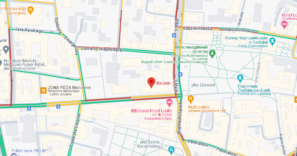 Простір «Баобаб» знаходиться у центрі Любліна за адресою: вулиця Краківське передмістя, 39б (Krakowskie Przedmieście 39b, 20-002 Lublin).