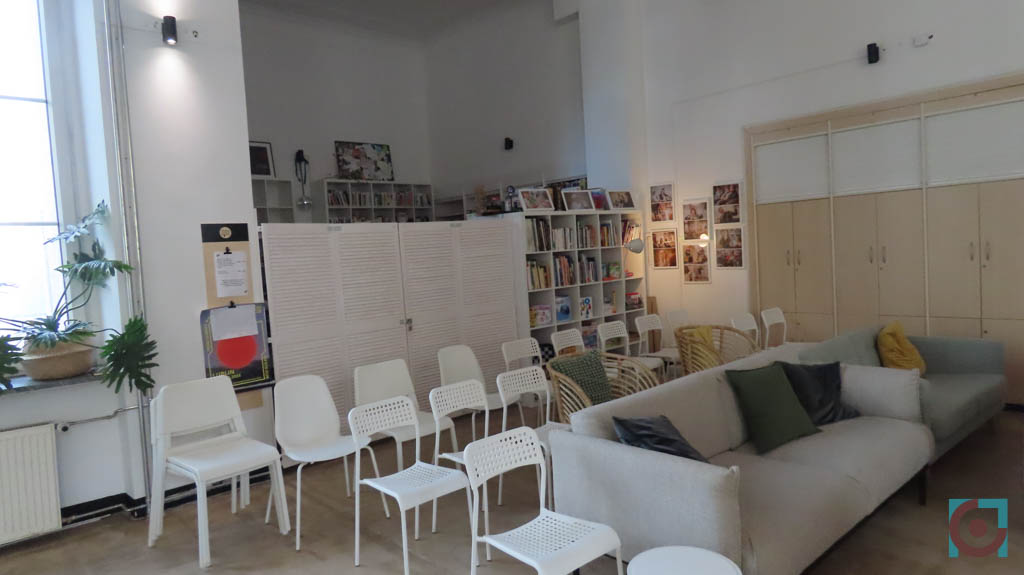Розмовляємо з Анною Домбровською поруч з інформаційним центром. Відвідувачів у цей час небагато: у дитячому куточку грається дві дівчинки, за якими наглядає працівниця; ще одна жінка консультується у волонтера щодо адміністративних питань, одна жінка самотньо сидить в іншому кутку біля сцени.