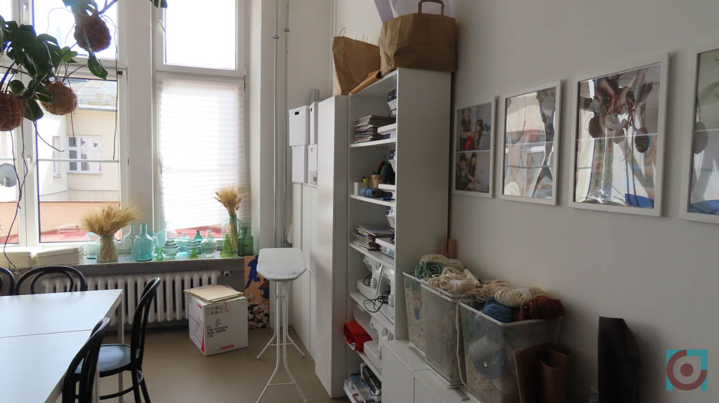 Далі прямуємо до майстерень. Їх є дві, умовно розділені на жіночу і чоловічу. У жіночій майстерні сьогодні порожньо, тканини і швейні машини акуратно стоять на полицях.