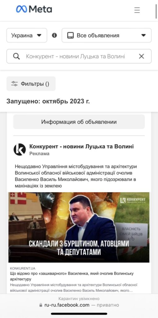 За даними Меta (Facebook), 26 жовтня на сторінці сайту «Конкурент» у Facebook робили платну рекламу. Зокрема, була оплачена реклама тексту з назвою «Що відомо про «зашкварного» Василенка, який очолив Волинську архітектуру».