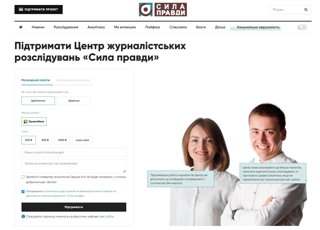 «Особливо, якщо це роблять журналісти і редактори, адже велику роль грає довіра і особисті знайомства аудиторії із членами команди. Загалом можу сказати, що сторінку для підтримки медіа ми точно розробили не дарма, адже завдяки читачам і глядачам зуміли зібрати близько 120 тисяч гривень за майже 1,5 року. Це не дає змогу повністю фінансувати роботу медіа, але дає можливість закривати деякі термінові і критичні потреби команди. Тож ми дуже вдячні читачам і глядачам і намагаємося виправдовувати їхню довіру», – ділиться досвідом керівник «Сили правди».