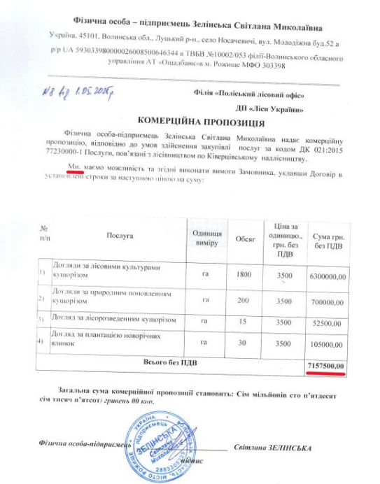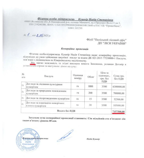 Двоє з них відповіли лісівникам в один день, а третя підприємиця зачекала і відписала наступного. Та найцікавіше, що усі жінки надали ідентичні комерційні пропозиції. Кожна оцінила свої послуги на суму 7 мільйонів 157 тисяч 500 гривень. Навіть описки у всіх трьох підприємиць були однакові.