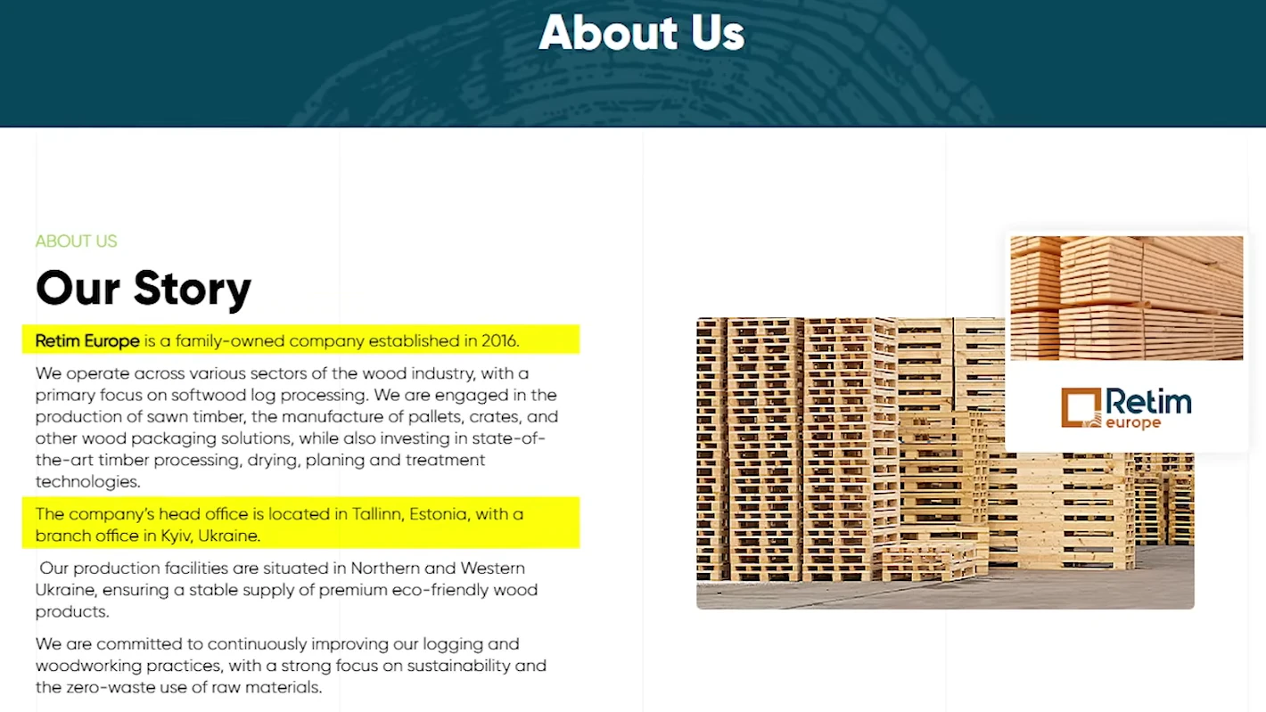 Головний офіс підприємства начебто знаходиться у Таллінні. Однак, «Ретім Європа» дуже тісно пов’язана з Україною: тут хоститься сайт компанії, у Києві розташована її філія, навіть виробничі потужності естонської компанії знаходяться на заході та півночі нашої країни. В асортименті компанії – такі ж піддони і гранули, як у «Бренвеля».