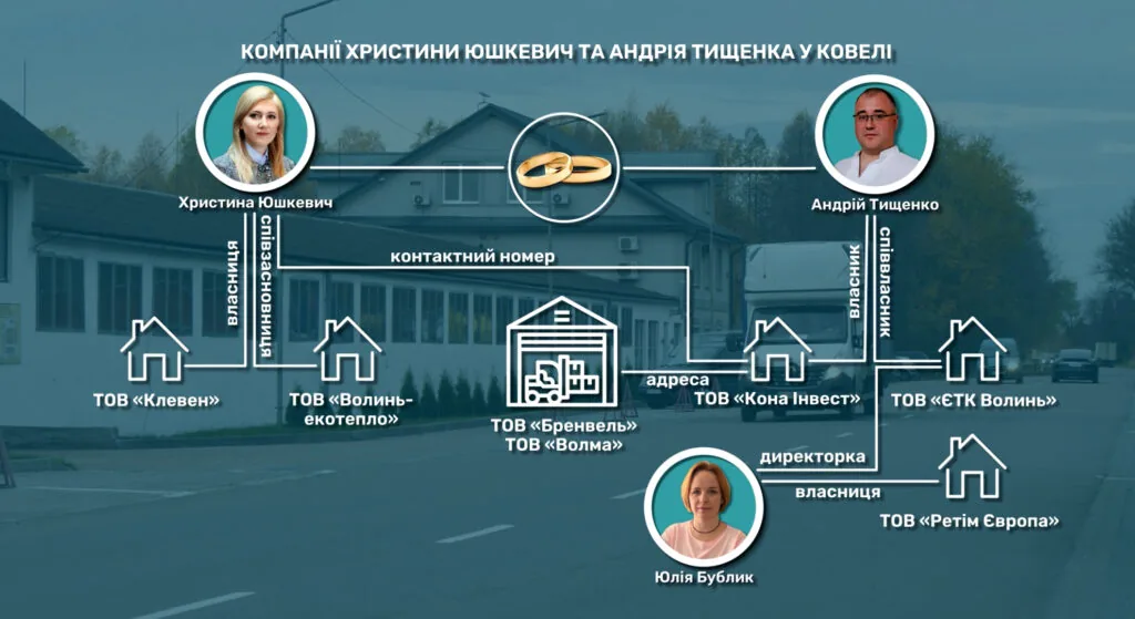 У 2019 році Христина Юшкевич стала власницею фірми «Клевен» у Ковелі на вулиці Драгоманова. Андрій Тищенко у тому ж році став співвласником компанії «ЄТК Волинь», яка зареєстрована на тій самій вулиці. Нагадаємо, що цю компанію свого часу очолювала вже згадана Юлія Бублик – власниця естонської компанії «Ретім Європа».