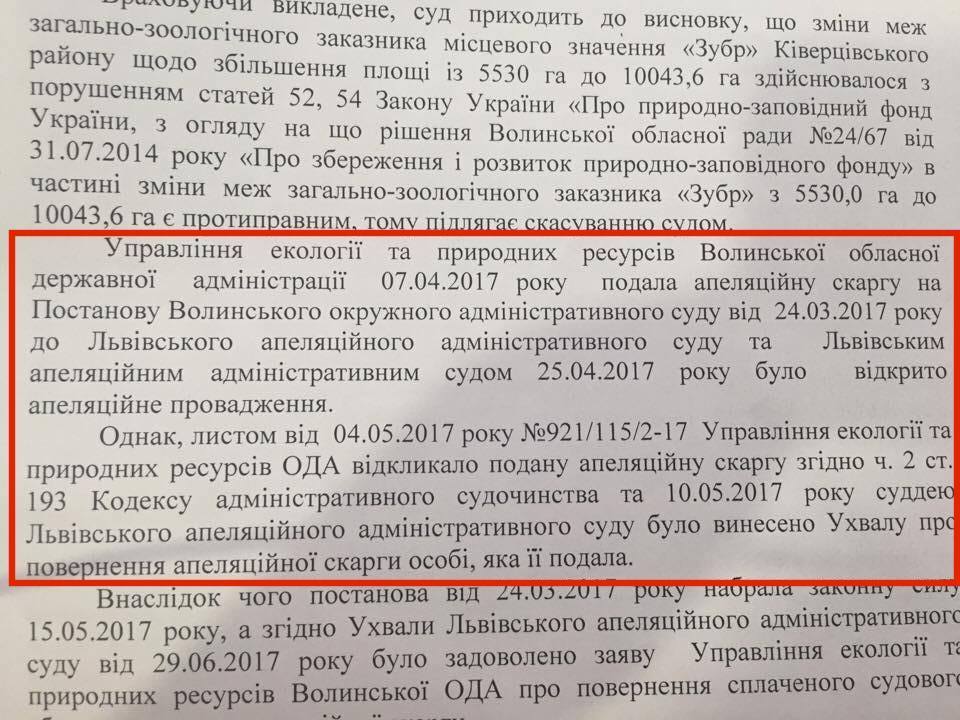 Волинська обласна рада погодилась з рішенням Волинського адмінсуду і апеляцію не подавала. Третя сторона, яка не заявляла самостійних вимог, Управління екології і природних ресурсів Волинської ОДА, у квітні цього року подала апеляцію до Львівського апеляційного адміністративного суду. Проте за місяць її відкликали.