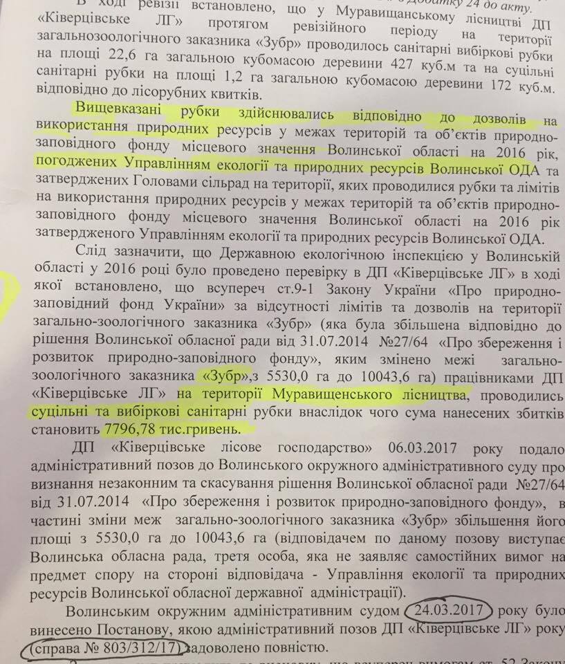 Однак ківерцівські лісівники знайшли спосіб за допомогою Феміди ухилитися від компенсації цих збитків. Так у березні 2017-го ДП Ківерцівське ЛГ подало позов до Волинського окружного адмінсуду про скасування рішення облради від 31 липня 2014 року, яким межі заповідника «Зубр» було збільшено з 5530,0 га до 10043,6 га. І хоча термін позовної давності відносно даного рішення минув, у суді Ківерцівський лісгосп переконав суддю Сергія Костюкевича, що ні.