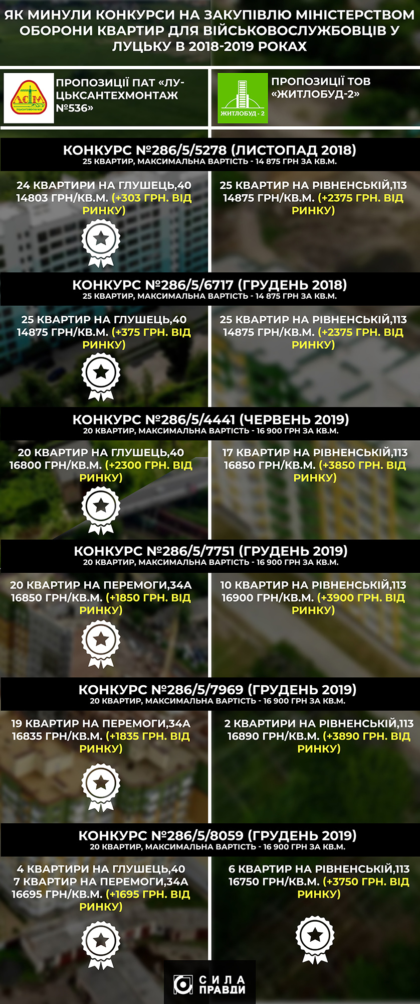 Таким чином, на шести конкурсах Міноборони купило в «Луцьксантехмонтажу» 119 квартир на понад 120 мільйонів гривень та 6 квартир у «Житлобуду-2» на 7 мільйонів.