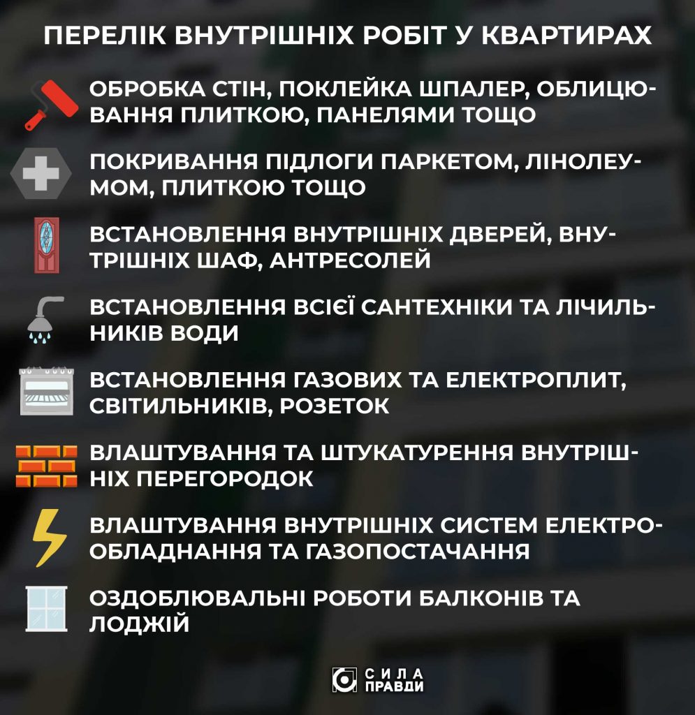 Ще однією важливою умовою конкурсу було те, що всі квартири мали бути готовими «під ключ». Тобто, з внутрішнім ремонтом. Це і штукатурка, фарбування стін, стелі, поклейка шпалер в квартирах, вкладання лінолеуму, плитки на підлозі, встановлення міжкімнатних дверей, сантехніки (мийка, умивальник, унітаз, ванна), засобів обліку води, встановлення електро- чи газових плит, світильників, розеток, влаштування внутрішніх перегородок, оздоблення.