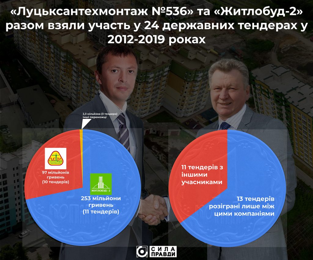 За підрахунками «Сили правди» на основі даних «Вісника державних закупівель» та «Prozorro», «Луцьксантехмонтаж №536» та «Житлобуд-2» впродовж 2012-2019 років спільно взяли участь у щонайменше 24 тендерах на понад 353 мільйони гривень. Договорів на 97 мільйонів підписали із фірмою Чорнухи, а на 253 мільйони – із Стефановичем.