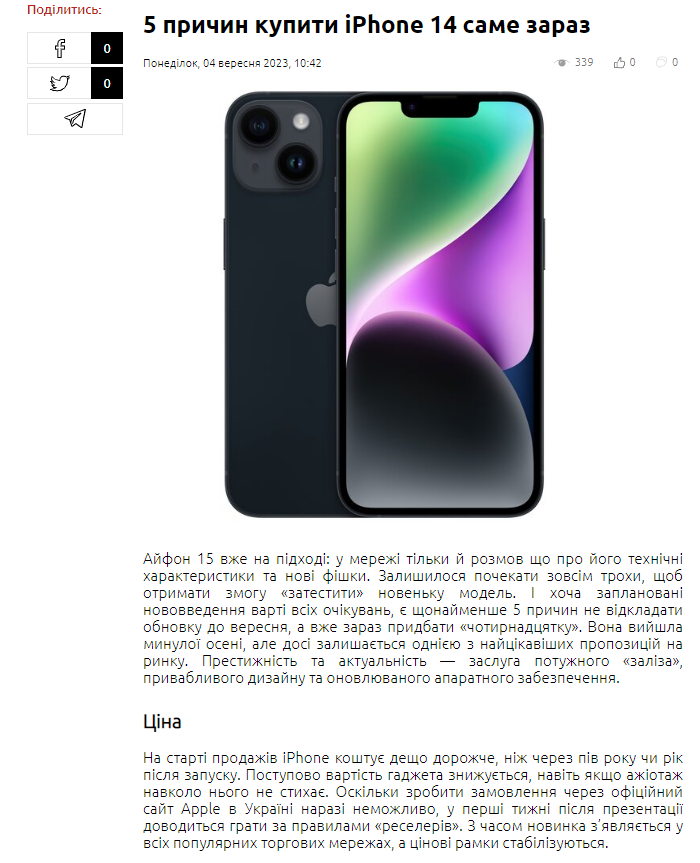 За період моніторингу тільки два сайти публікували комерційну джинсу. Так, на сайті «Конкурент» розмістили комерційну джинсу із закликом «5 причин купити iPhone 14 саме зараз». Гіперпосилання в тексті спрямовує на сайт магазину «Moyo».