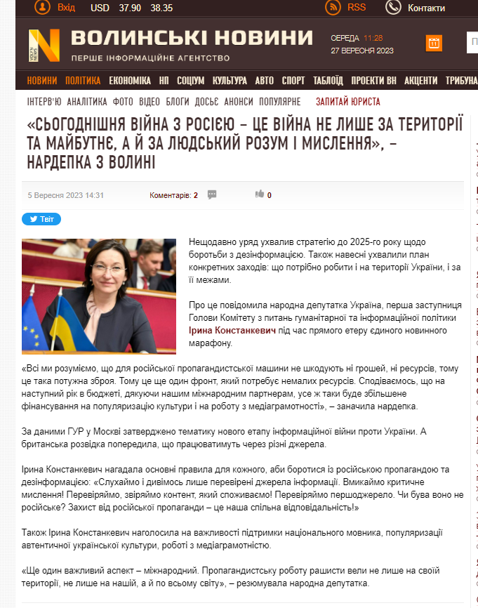 За період моніторингу політичну джинсу опублікували лише на одному сайті — «Волинські новини». Йдеться про публікацію про нардепку Ірину Констанкевич — в новині «Сьогоднішня війна з Росією – це війна не лише за території та майбутнє. А й за людське мислення», – нардепка з Волині». У новині опублікували думку політикині про війну, яка розповідає загальновідомі речі без жодної нової інформації.
