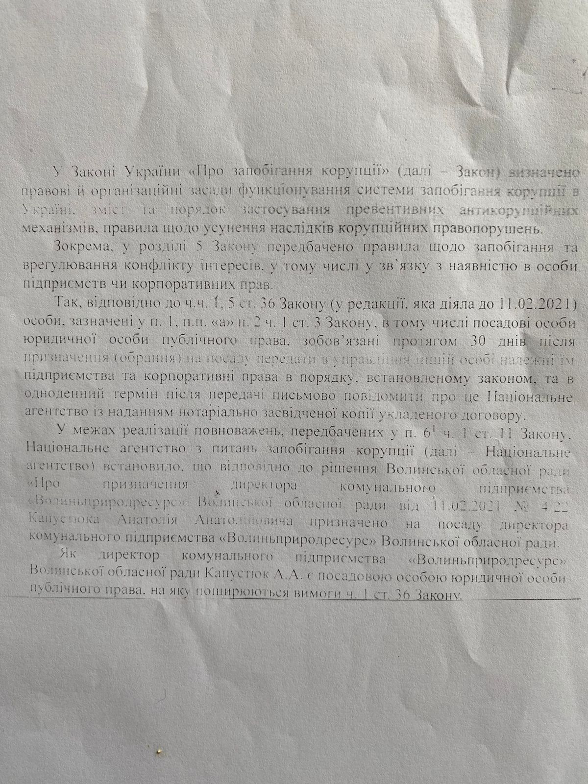 Національне агентство з питань запобігання корупції виявило порушення у діяльності директора комунального підприємства «Волиньприродресурс» Анатолія Капустюка. Посадовцю закидають те, що він із призначенням на посаду не передав в управління іншим особам належний йому бізнес та корпоративні права.