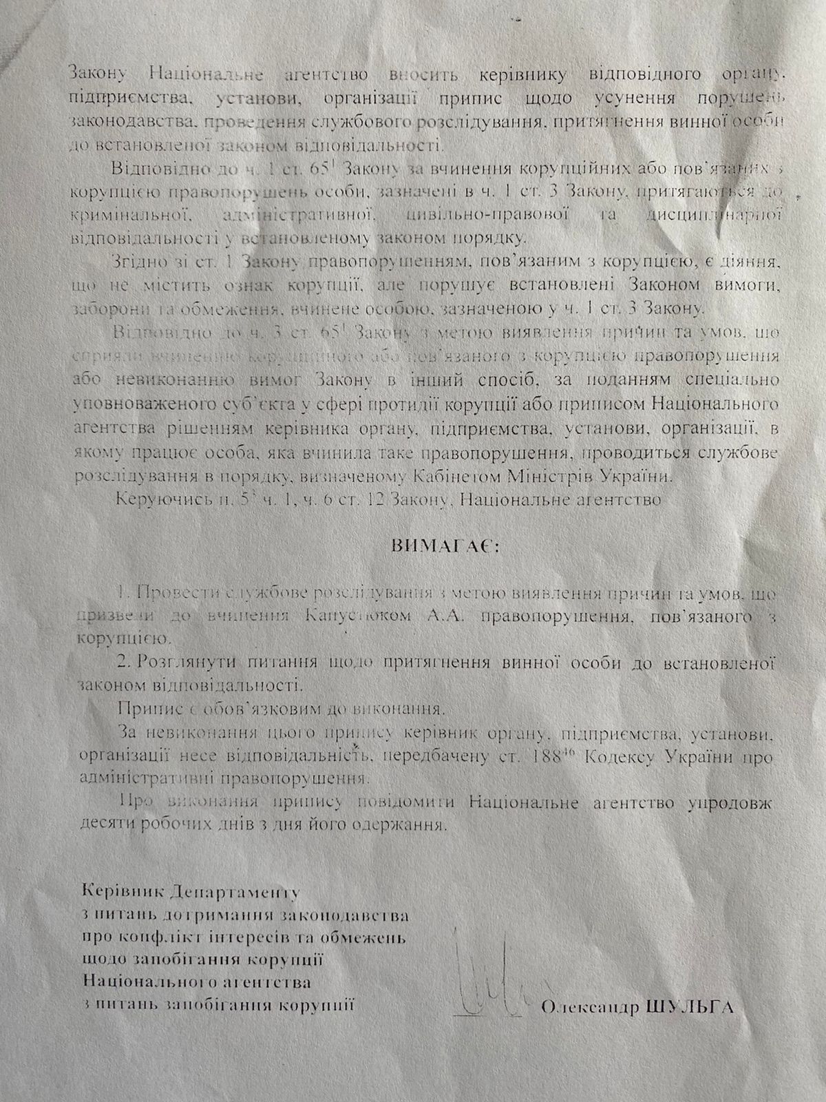 Як встановили правоохоронці, на момент призначення та через місяць після нього Анатолій Капустюк залишався засновником трьох підприємств: ТОВ «ФСБ-Охорона», ТОВ «Юридична фірма «Правда», ТОВ «Амбер-інвест». Тобто, порушив вимоги закону «Про запобігання корупції».