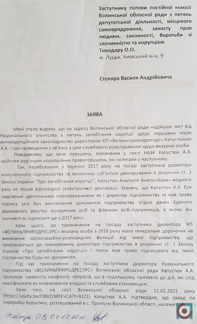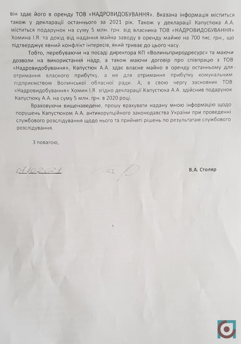 Тобто, перебуваючи на посаді директора КП «Волиньприродресурс» та маючи дозволи на використання надр, а також маючи договір про співпрацю з ТОВ «Надровидобування», Анатолій Капустюк здає власне майно в оренду останньому для отримання власного прибутку, а не для отримання прибутку комунальним підприємством Волинської обласної ради», – йдеться в заяві Столяра.
