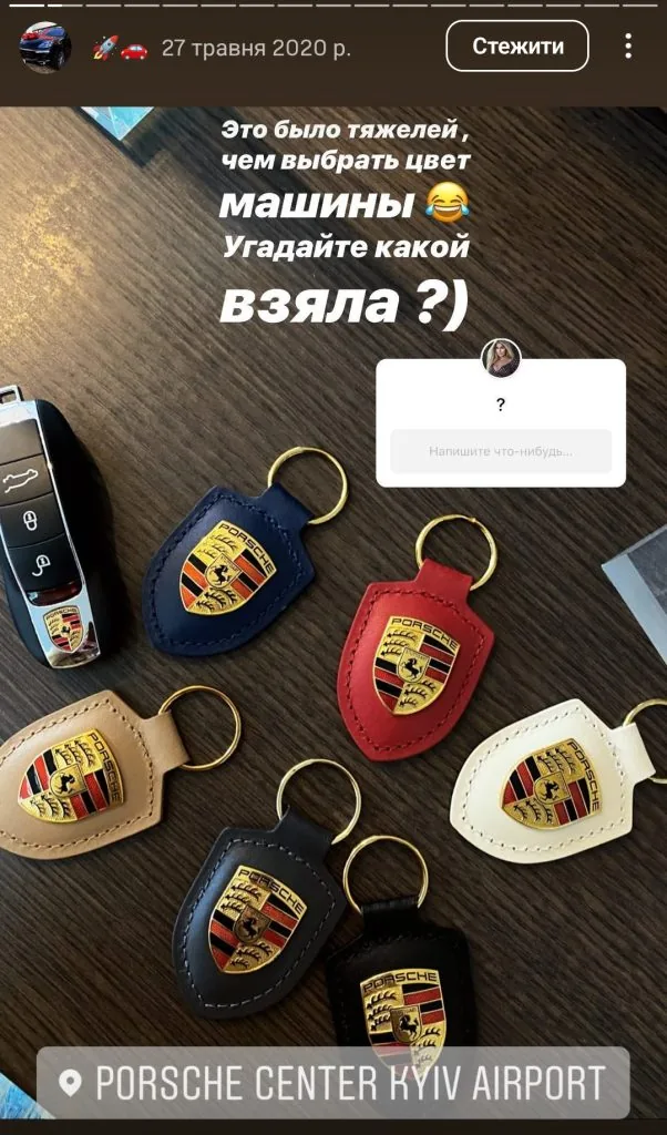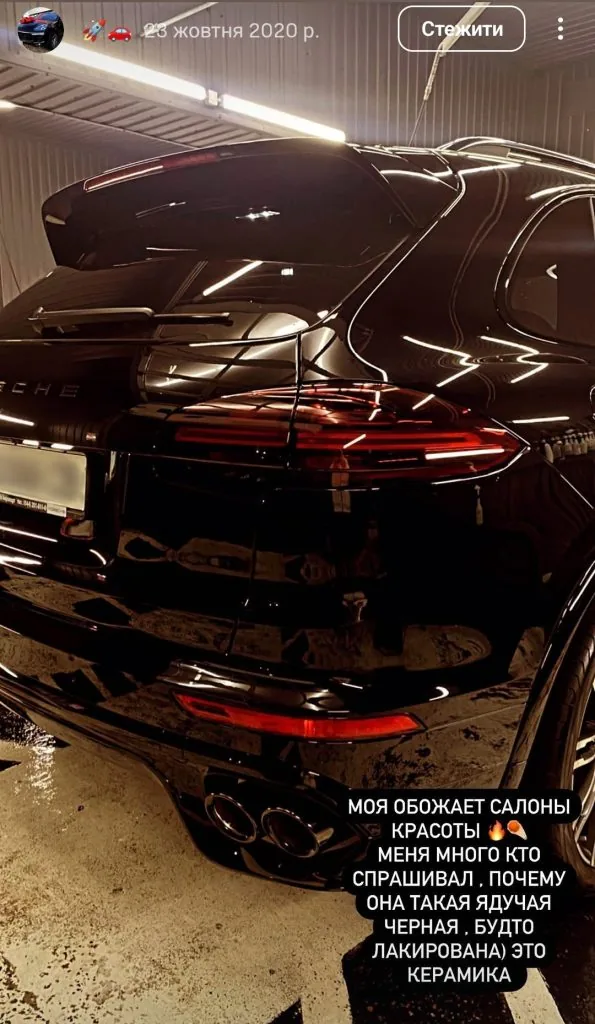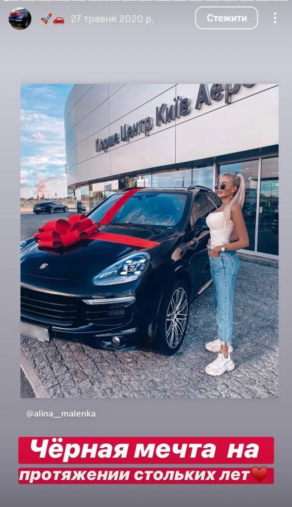 З соцмереж видно, що вона придбала Porsche Cayenne у 2020 році з автомобільного салону. У своєму Instagram Аліна називала автівку «чорною мрією».
