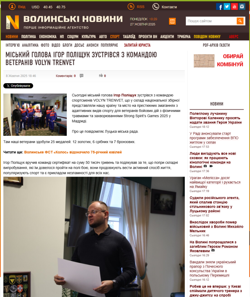 Так, сайт «Волинські новини» розмістив іміджеву новину про Луцького міського голову Ігора Поліщука, який зустрівся з командою спортсменів VOLYN TRENVET 8 жовтня і вручив сертифікат на 50 тисяч гривень.