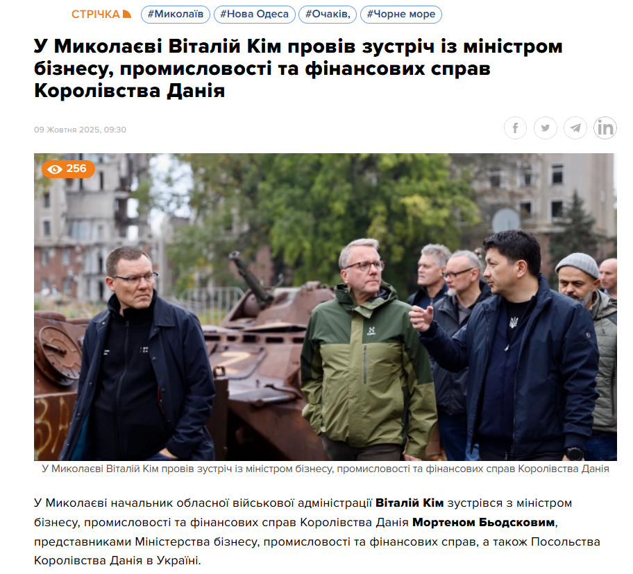 Ще одна новина на сайті також стосувалося голови Миколаївської ОВА. У ній йшлося про зустріч Віталія Кіма з делегацією з Данії. Компліментарний матеріал, по суті, був звітом пресслужби політика. Видання послалось на фейсбук-сторінку на Миколаївської ОВА.